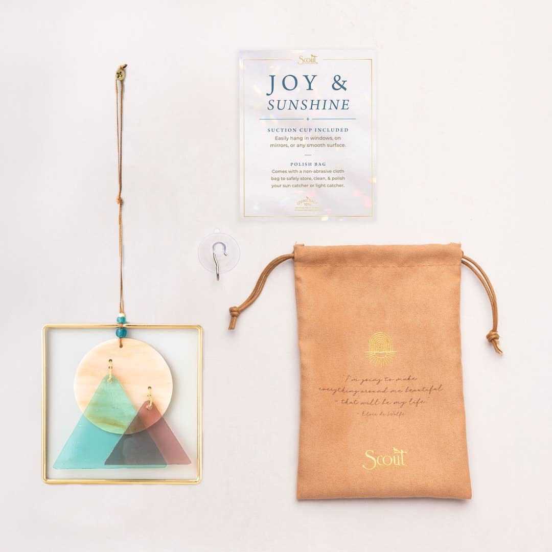 Each piece of stained glass is hand cut and framed in graceful gold in one of four harmonious designs. The addition of glass and metal beads on the natural cord creates a thoughtful, layered accent. Every stained glass light catcher comes in a beautiful polish bag making it the perfect gift to create wonder from light.