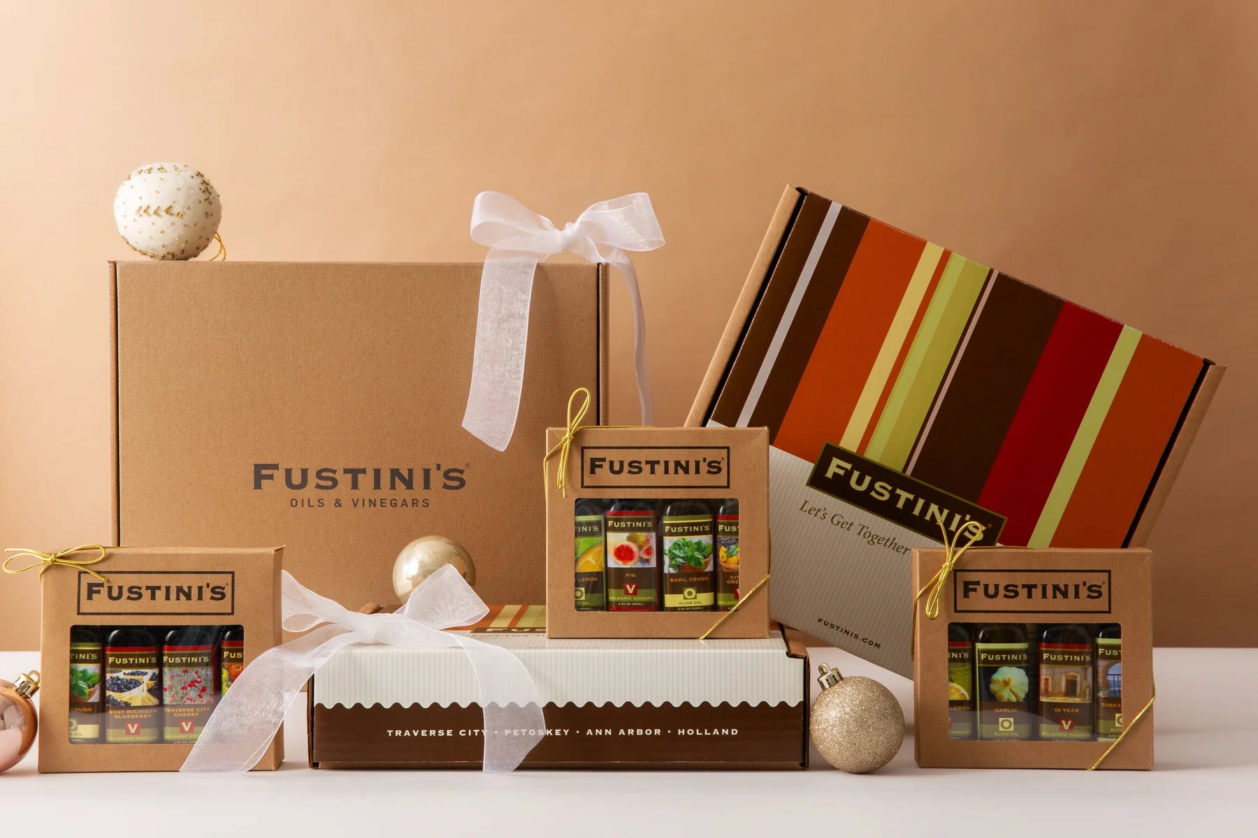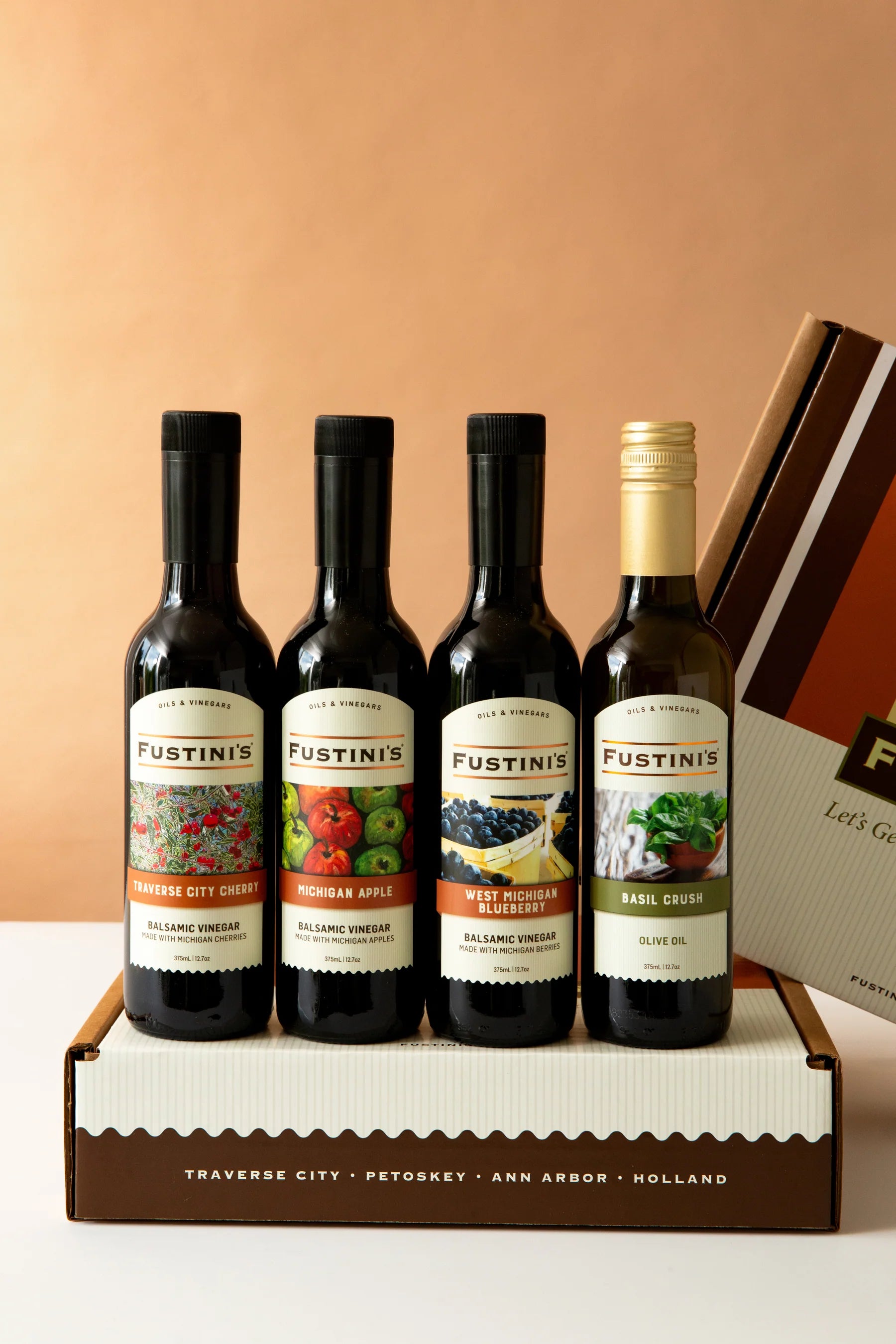 Crafted exclusively for Fustini’s, this gift set celebrates the flavors of Michigan, made with 100% Michigan-grown fruit purees and juices. Paired with Fustini’s Basil Crush Olive Oil, these locally inspired balsamic vinegars create versatile combinations perfect for salads, marinades, and roasted vegetables.