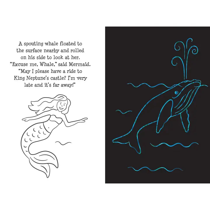 Help the mermaid princess find her lost treasure and get back to the castle in time for her royal birthday ball! This is a Trace-Along Scratch and Sketch! Use the wooden stylus included to trace the white outlines on the black-coated pages and reveal the gold, silver, and rainbow-swirl undersea world beneath!